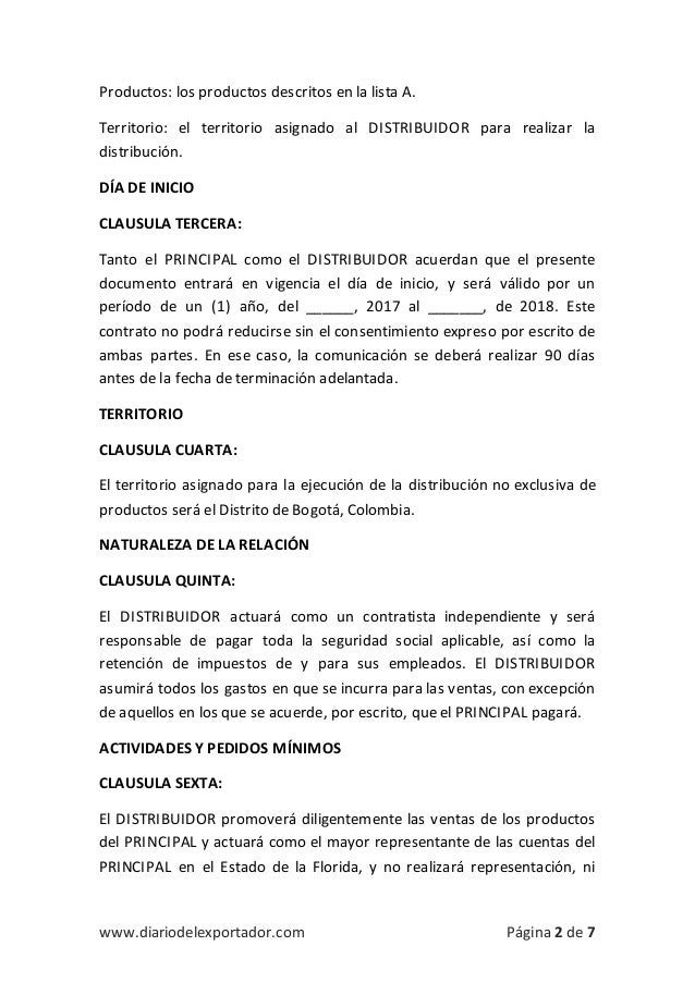 Contrato de distribucion internacional modelo. Requisitos del contrato de concesin o distribucin comercial internacional-. El territorio asignado para la ejecucin de la distribucin no exclusiva de productos ser el Distrito de Bogot. Este Contrato es un modelo.