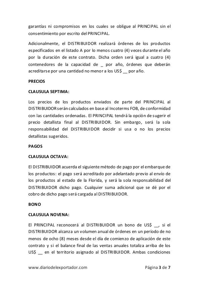 Este contrato no podr reducirse sin el consentimiento expreso por escrito de ambas partes. Que las Partes acuerdan celebrar el presente contrato de DISTRIBUCIN en adelante el Contrato de acuerdo con las siguientes. El exportador Vendedor se obliga a.