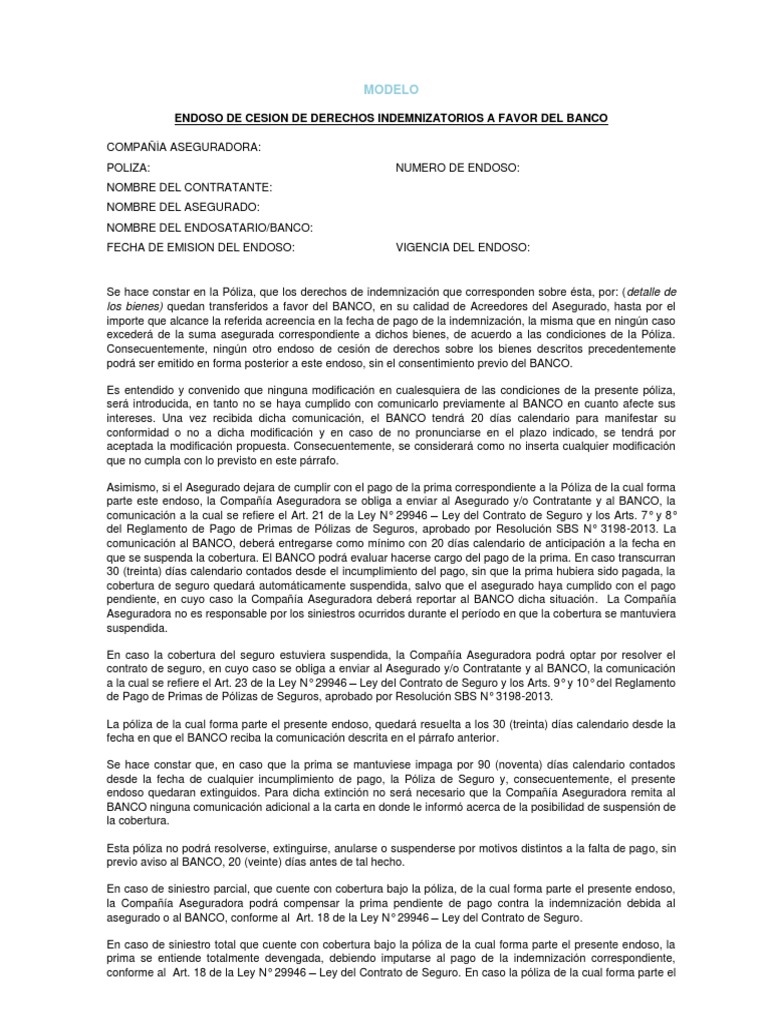 Modelo De Endoso De Cesion De Derechos Indemnizatorios Pdf Pdf Poliza De Seguros Seguro