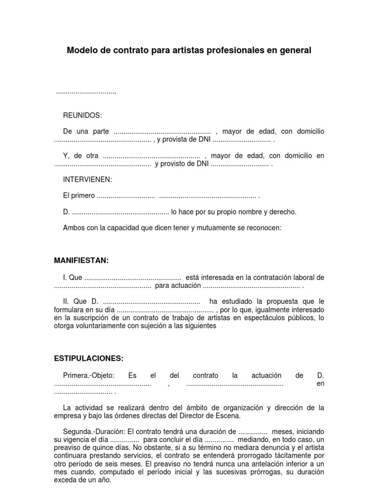 Modelo contrato artistas. En los contratos de duracin superior a diez das puede acordarse por escrito un perodo de prueba. El artista puede ser tanto un colectivo o empresa. Manifiestan 1 Que LA EMPRESA tiene previsto realizar y organizar un Concierto Musical en.